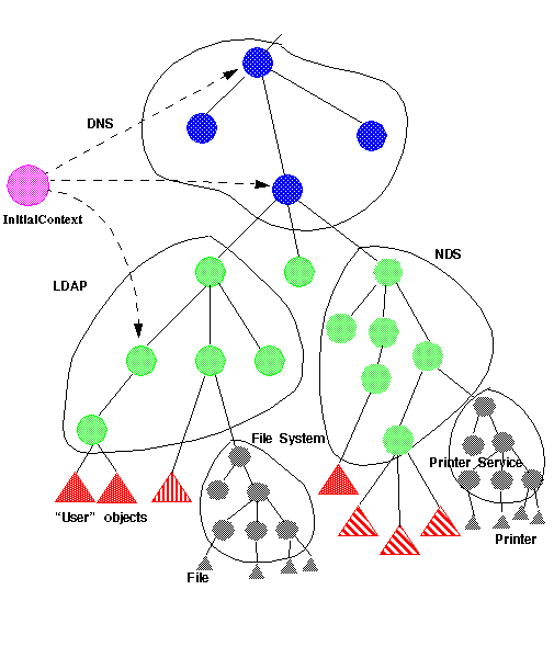 - Applications just see a composite namespace. They can access any type of object bound in any naming system in this arrangement.